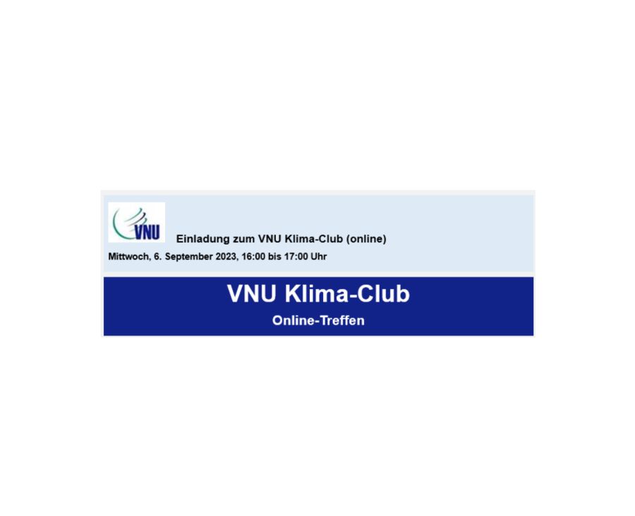 Das Ressort Klimaschutz des Verbands für Nachhaltigkeits- und Umweltmanagement (VNU e.V.) lädt zum 3. virtuellen Treffen des VNU Klima-Clubs ein: am Mittwoch, 6. September 2023, von 16:00 bis 17:00 Uhr.