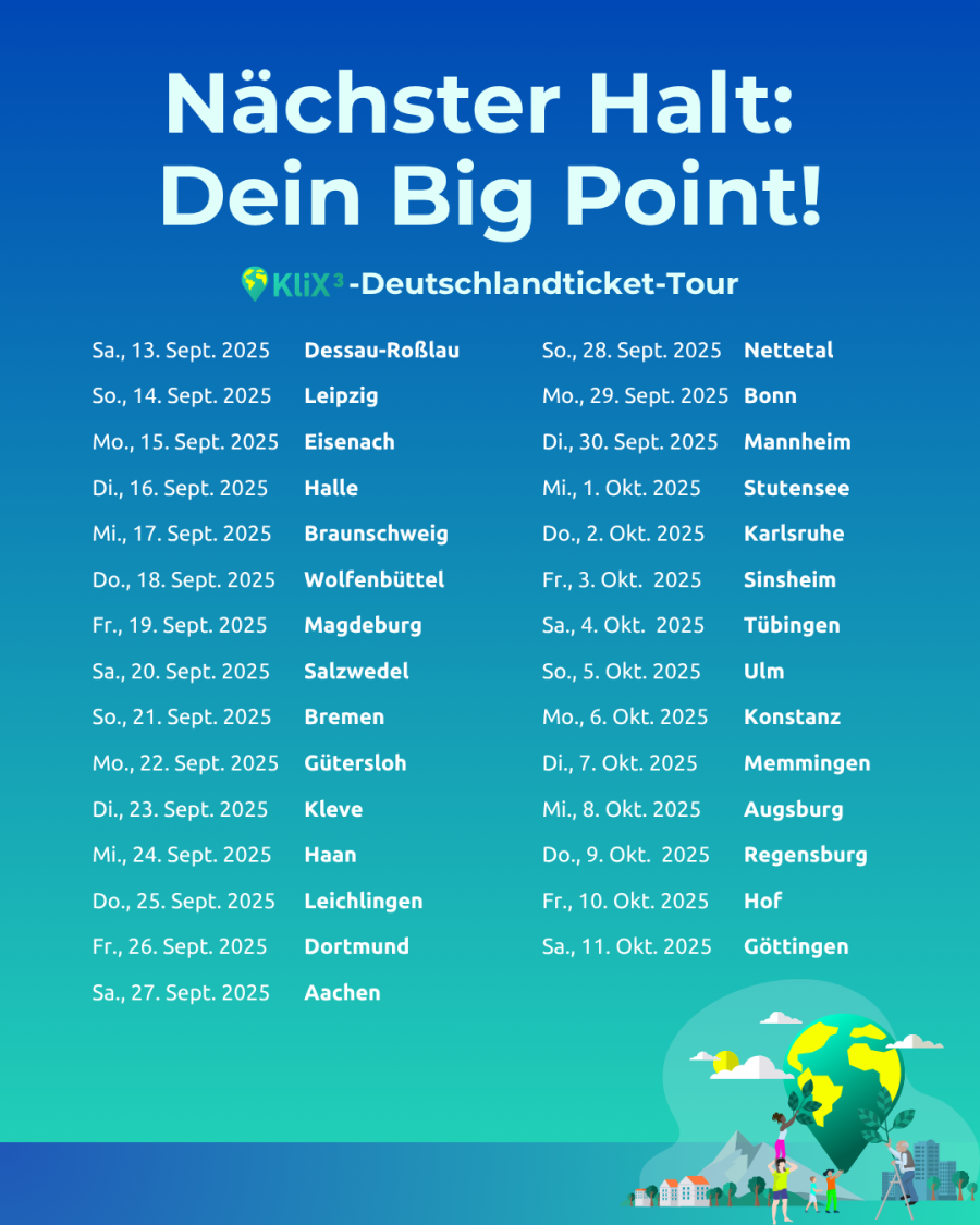 „Nächster Halt: Dein Big Point!“ Vom 13. September bis zum 11. Oktober 2025 tourt das KliX³-Team einmal durch die Bundesrepublik
