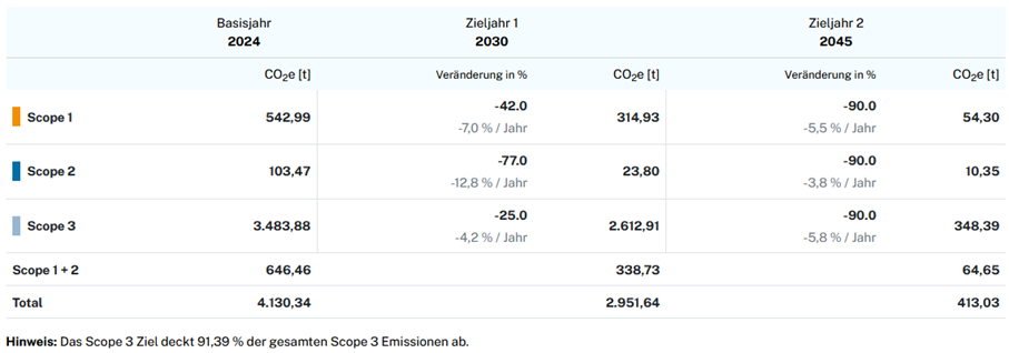 Bei der Erstellung eines Reduktionsziels haben Sie die Möglichkeit auszuwählen, welche Scopes Sie mit ihrem Ziel abdecken möchten. So können Sie beispielsweise ein Ziel für Scope 1 und 2 definieren oder direkt alle drei Scopes in den Blick nehmen. Basis Ihres Ziels ist die Bilanz Ihres Basisjahres. Das Ziel kann mehrere Zieljahre als Zwischenziele umfassen, bis zu welchen eine bestimmte Treibhausgasemissionsreduktion erreicht werden soll. Üblich ist die Definition eines kurzfristigen (z.B. 2030) sowie eines langfristigen Reduktionsziels (z.B. 2045).