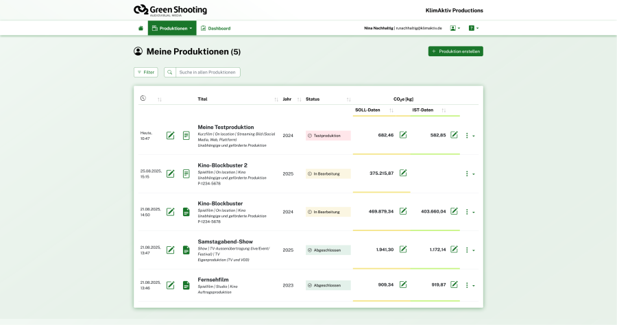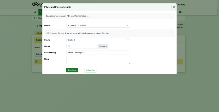 Als Sender oder Produktionsfirma haben Sie einen eigenen Fuhrpark oder eigene Studios und möchten ihre selbst gemessenen Durchschnittsverbräuche nicht bei jeder Produktion neu eintragen? Hinterlegen Sie jetzt Ihre eigenen Aktivitäten im Green Shooting Rechner, die dann allen Mitgliedern Ihres Unternehmens zur Verfügung stehen! Für weitere Infos und ein individuelles Angebot kontaktieren Sie uns unter info@greenshooting.de!