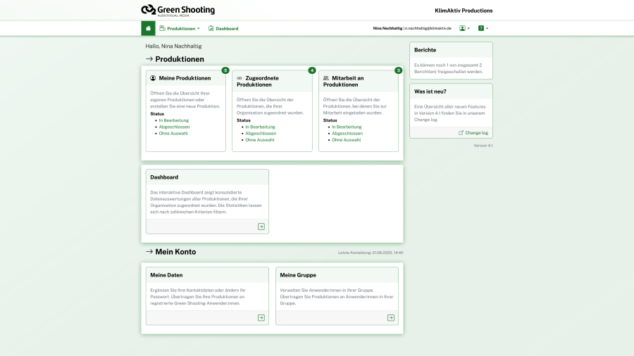 Nach dem Login landen Sie auf einer neuen Übersichtsseite mit Infos und Links zu Ihren Produktionen, Ihrem Konto, Ihren Berichten und vielem mehr. Mithilfe der Links in den Kacheln unter „Produktionen“ können Sie schnell in vorgefilterte Produktionslisten springen, z.B. nur eigene Produktionen mit Status „in Bearbeitung“.