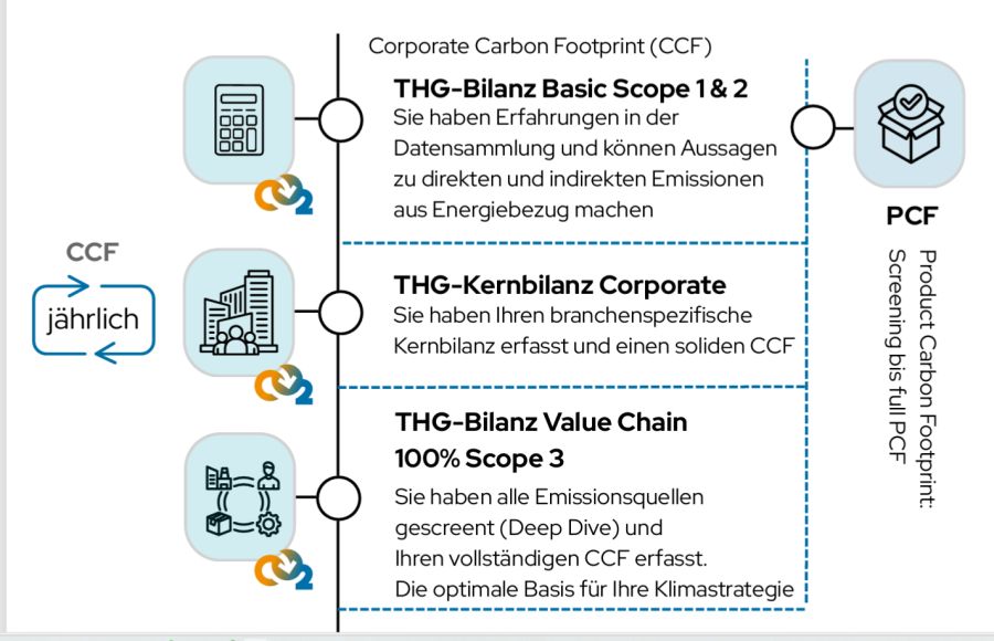 Der erste Schritt ist die Erstellung der THG-Bilanz Basic Scope 1 & 2, also für alle Emissionen, die durch den eigenen Energieverbrauch, den Betrieb von Anlagen und Fahrzeugen oder den Einkauf von Strom und Wärme entstehen.