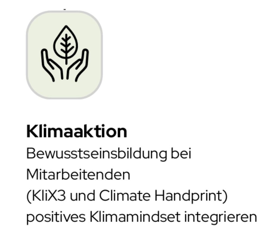 Gerade an den Schnittstellen zur unternehmerischen Klimastrategie kommt es auch auf das persönliche Bewusstsein an. So unterstützen Sie durch Bewusstseinsbildung die Umsetzung Ihrer Klimaschutzziele. Oft ist zum Beispiel das nachhaltige Pendeln der Mitarbeitenden ein Hebel zum Erreichen der Klimaschutzziele in Scope 3. Durch Maßnahmen zur Bewusstseinsbildung kann hier ein Umdenken stattfinden. KlimAktiv ist für die Unternehmenskampagne von KliX3 verantwortlich. Die Teilnahme ist für Unternehmen kostenlos. Über die Website von KliX³ können die Mitarbeitenden teilnehmender Unternehmen auf Basis der individuellen CO₂-Bilanz einen persönlichen Klimaschutzplan entwickeln. Die Unternehmen erhalten ein kostenloses Bildungspaket zur Motivation aller Kolleginnen und Kollegen.